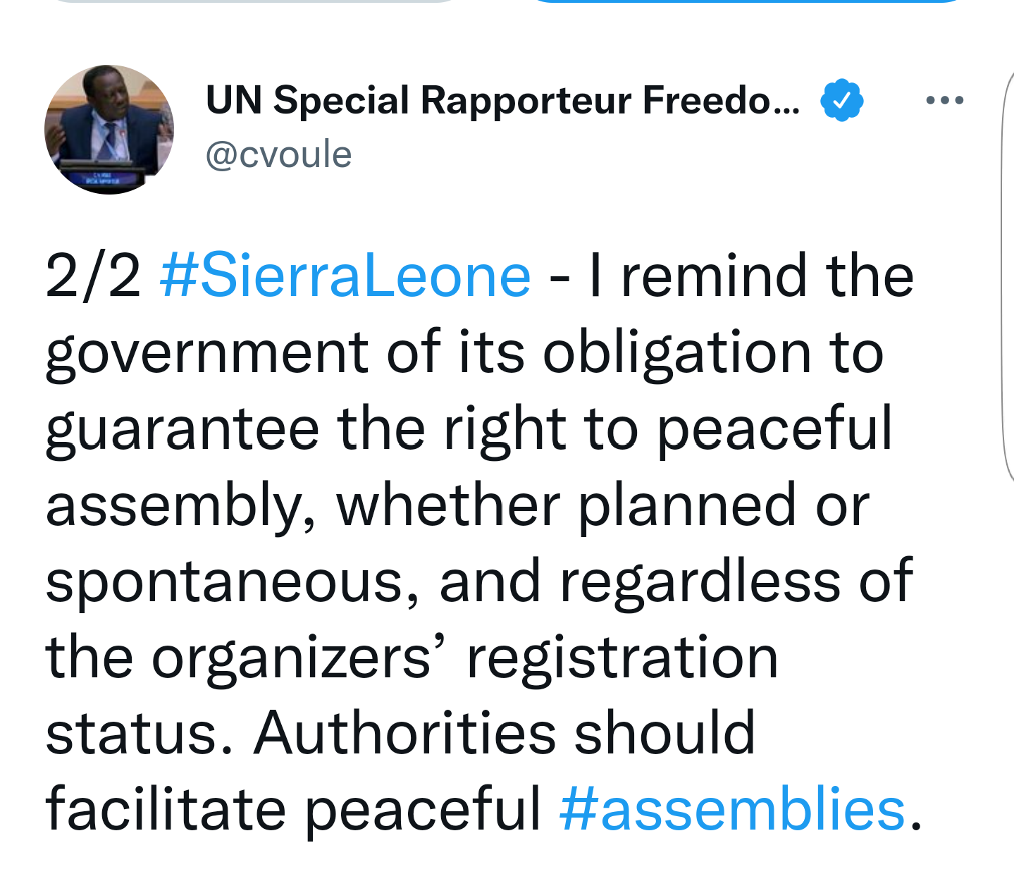 The United Nations Special Rapporteur on the Rights to Freedom of Peaceful Assembly and of Association has in a post on social media reminds the Government of Sierra Leone of its obligation to guarantee the right to peaceful assembly.