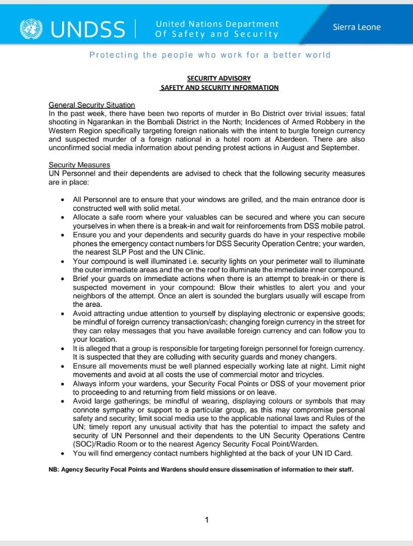 The United Nations Department of Safety and Security (UNDSS) has issued a security advisory for foreign nations in Sierra Leone.