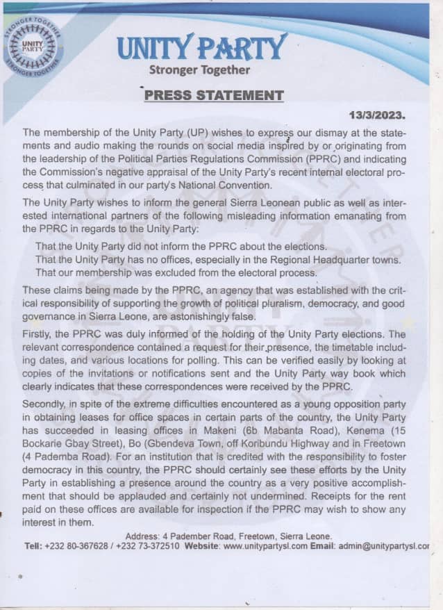 The Unity Party wishes to inform the general Sierra Leonean public as well as interested international partners of the following misleading information emanating from the PPRC in regards to the Unity Party: