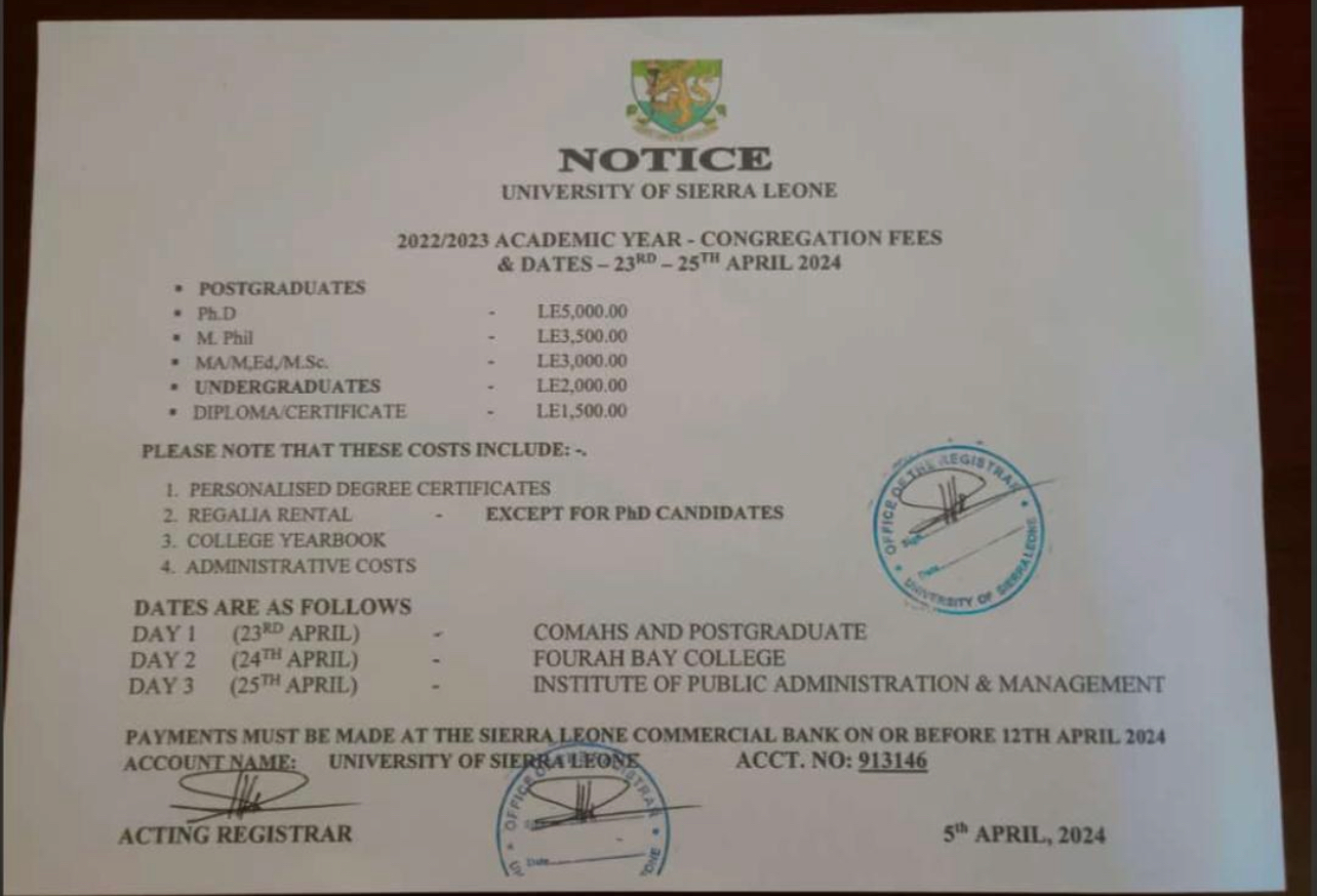 The University of Sierra Leone has unveiled the details of fees and dates for the 2022/2023 academic year congregation. Set to occur from April 23rd to April 25th, 2024, the event will include both postgraduate and undergraduate students from diverse fields.