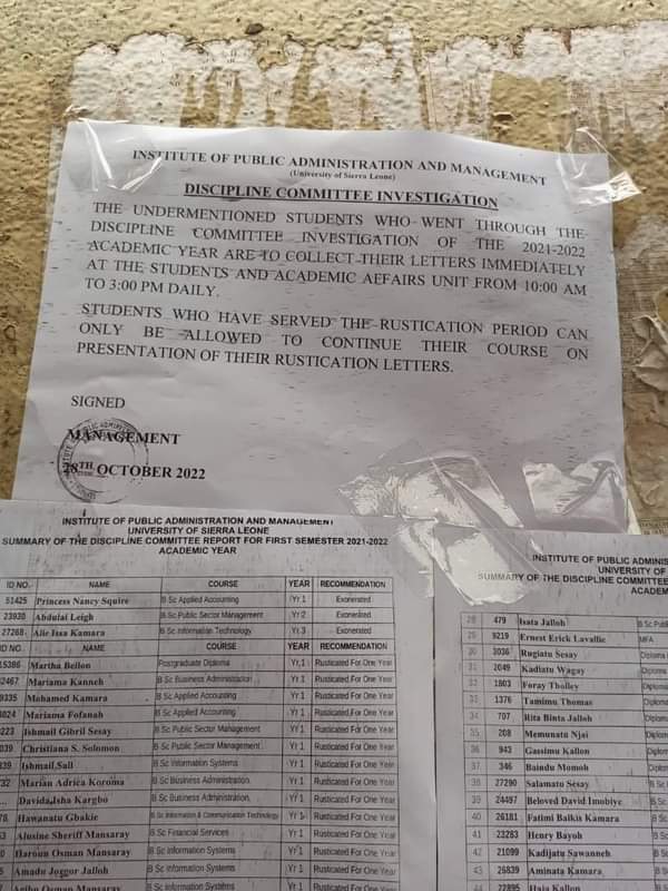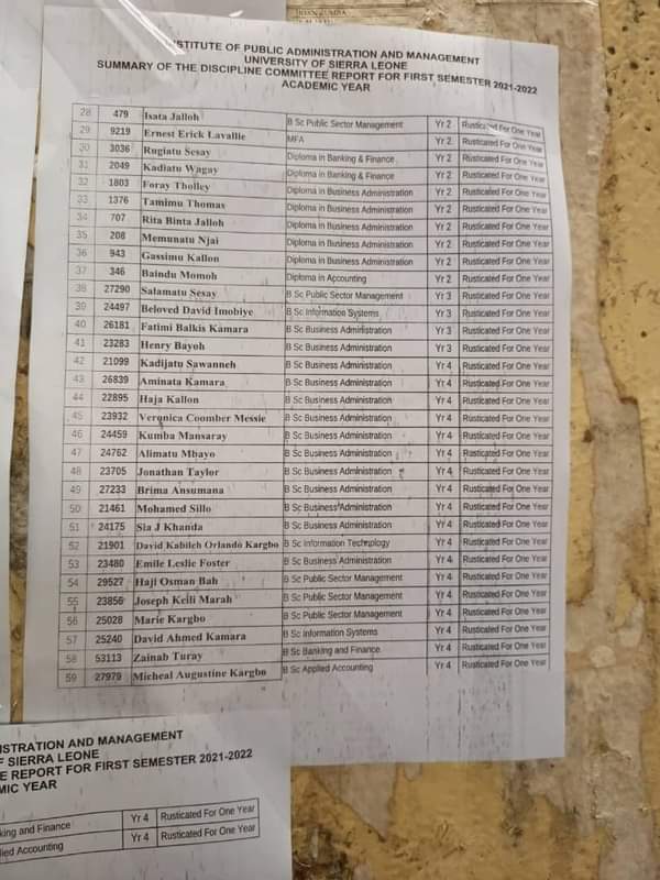 The Institute of Public Administration and Management (IPAM), University of Sierra Leone has rusticated about 61 Students from the University for exams malpractice.