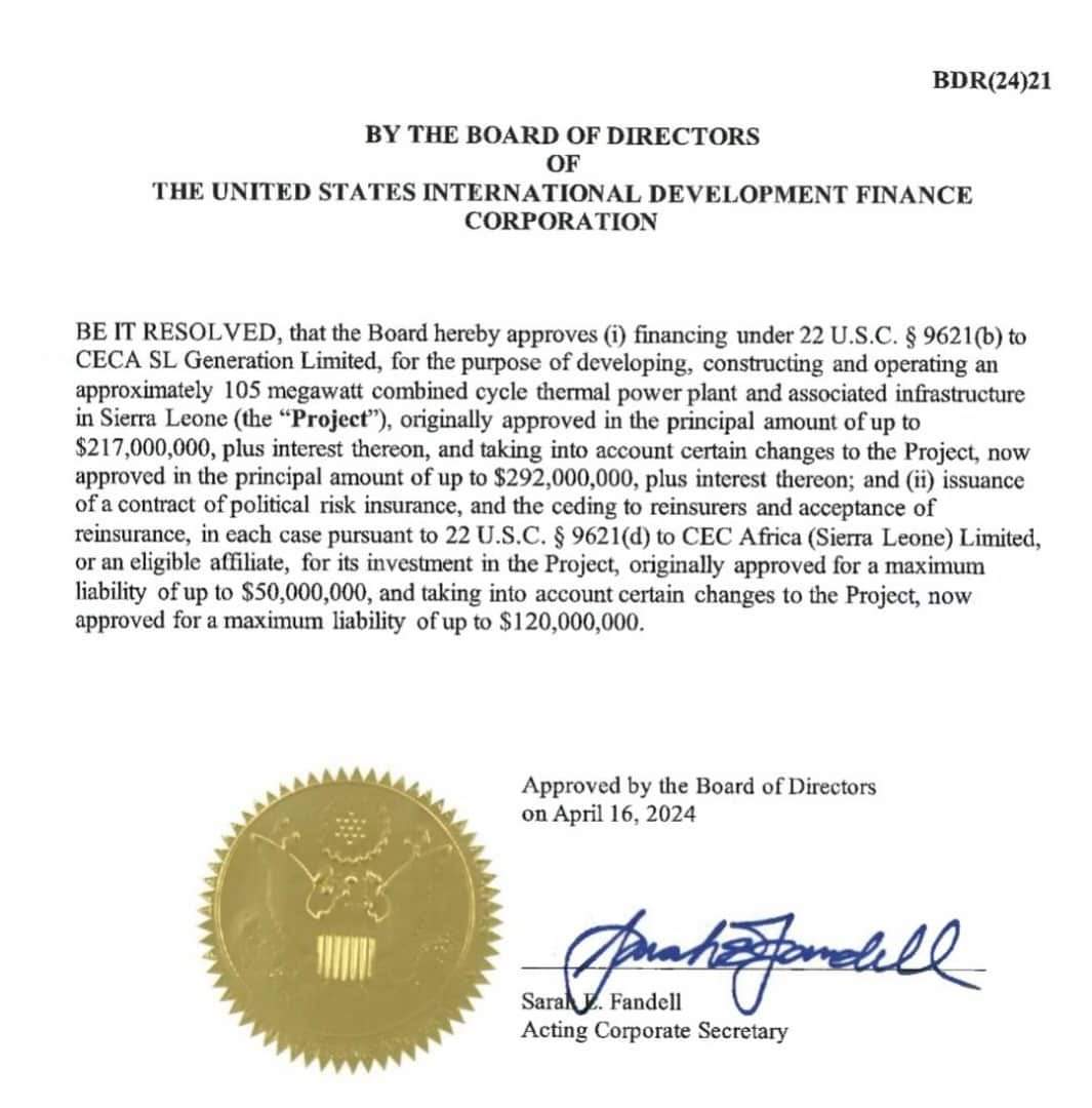 Additionally, the resolution includes the issuance of a contract of political risk insurance to CEC Africa (Sierra Leone) Limited, or an eligible affiliate, for their investment in the project.