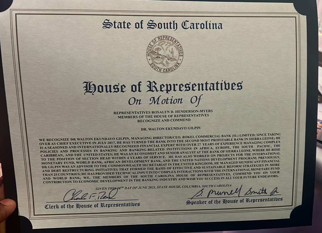 The Managing Director and CEO of RCBank Amb. Dr. Walton E. Gilpin (COOR) has today 11th July, 2023 received an award from The Members of the House of Representatives South Carolina for his contribution to Economic Development in the Banking Industry.