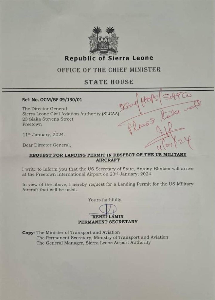The letter, written by Kenei Lamin, Permanent Secretary of the Chief Minister’s Office, requests a landing permit for a US military aircraft transporting Secretary Blinken to Freetown International Airport.