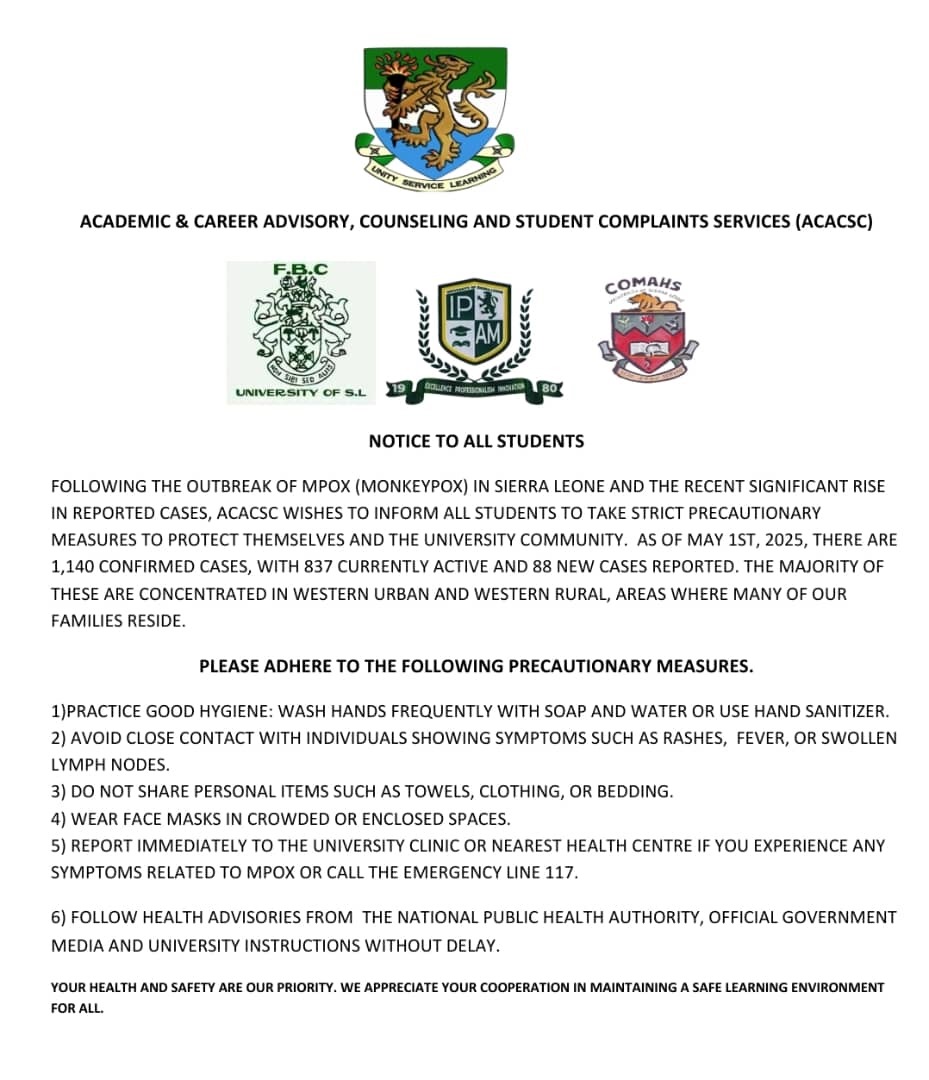 The University of Sierra Leone, through its Academic & Career Advisory, Counseling and Student Complaints Services (ACACSC), has issued an urgent notice to its student body in light of the significant increase in confirmed monkeypox (Mpox) cases across the country.