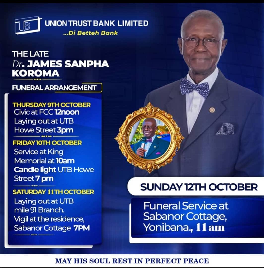 Union Trust Bank Limited (UTB) has announced the funeral arrangements for its late Founder and Chief Executive Officer, Dr. James Sanpha Koroma, who passed away recently at the age of 79.