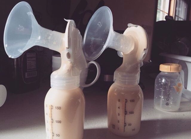 Posting this photo of two filled breast pump feeding bottles of milk, the business media consultant wrote: ” 99Problems, Breastmilk is not 1…”