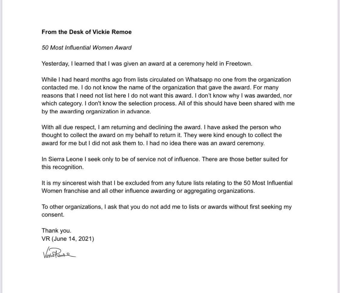 Sierra Leonean blogger, online marketer, content producer, writer and TV Host, Vickie Remoe has declined and returned a 50 Most Influential Women Award presented over the weekend.