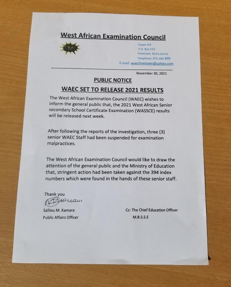 On the notice, three senior WAEC staff were suspended for examination malpractices. There will be also penalty for the students that worked with the three WAEC staff that are on suspension as their index numbers were tracked.