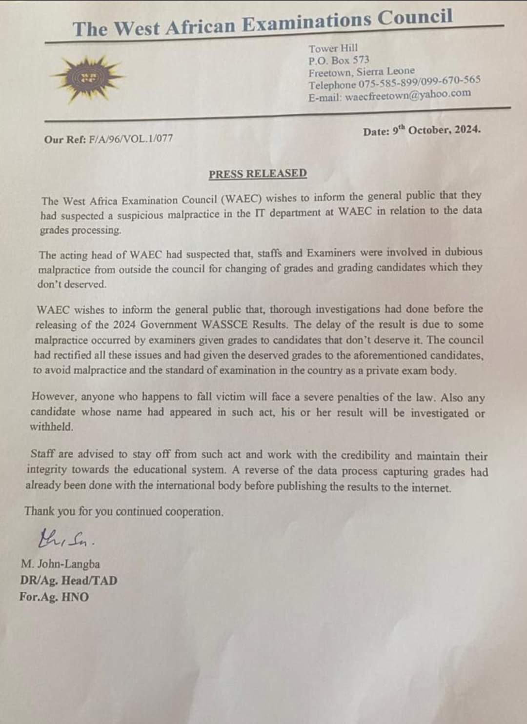 The Council assured the public that a thorough investigation was conducted prior to the release of the 2024 Government WASSCE Results. The delay in the release was attributed to this malpractice, where examiners were found to be assigning grades to candidates who did not merit them.