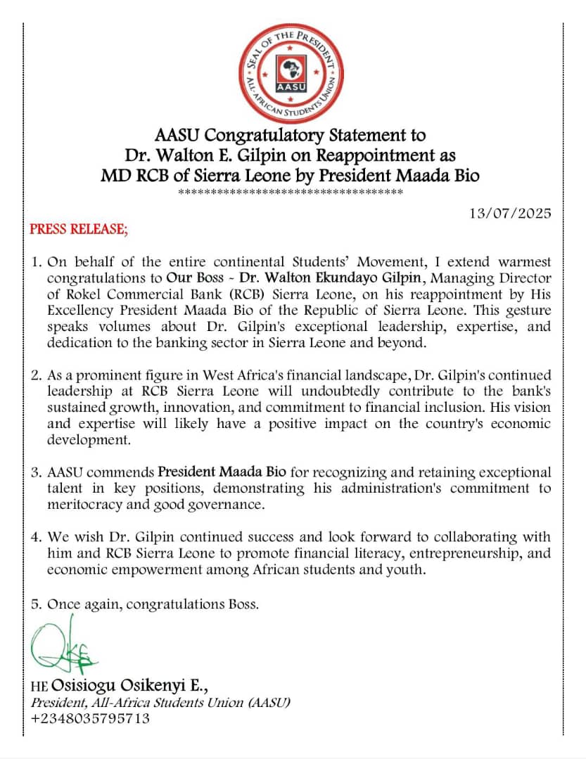 “Dr. Gilpin’s exceptional leadership and unwavering dedication to banking in Sierra Leone and beyond continue to inspire confidence,” the Union noted. “His reappointment is not only a testament to his excellence but also a sign of continuity in promoting financial inclusion and economic empowerment.”