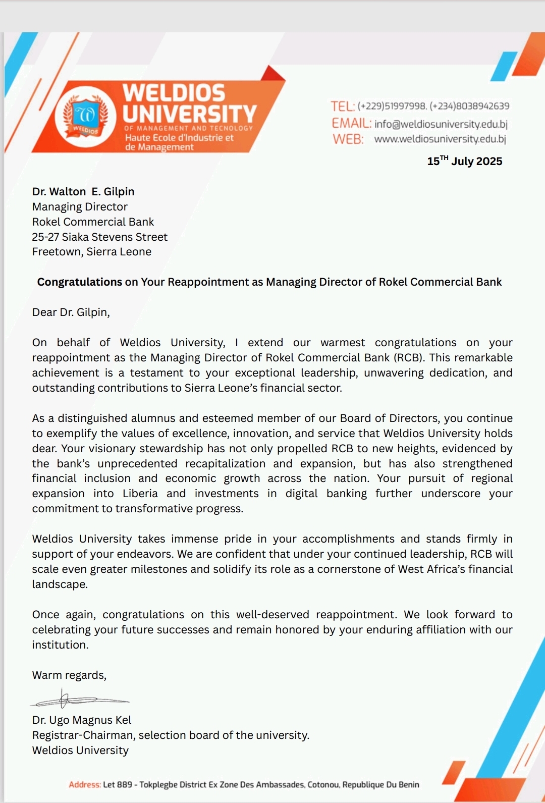 Prominent voices from across the financial, academic, and youth sectors have showered commendation on Dr. Walton Ekundayo Gilpin following his recent reappointment as Managing Director of Rokel Commercial Bank (RCB) by President Julius Maada Bio.