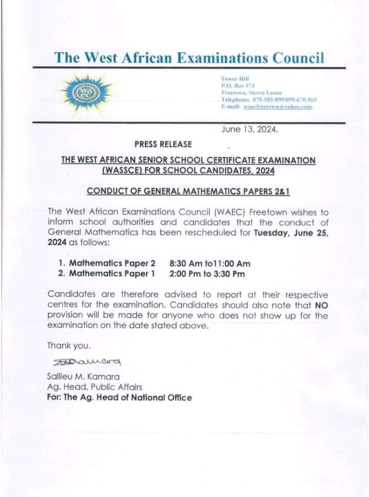 The West African Examinations Council (WAEC) wishes to announce to school authorities and candidates that the schedule for the General Mathematics papers for the West African Senior School Certificate Examination (WASSCE) for School Candidates, 2024, has been changed.