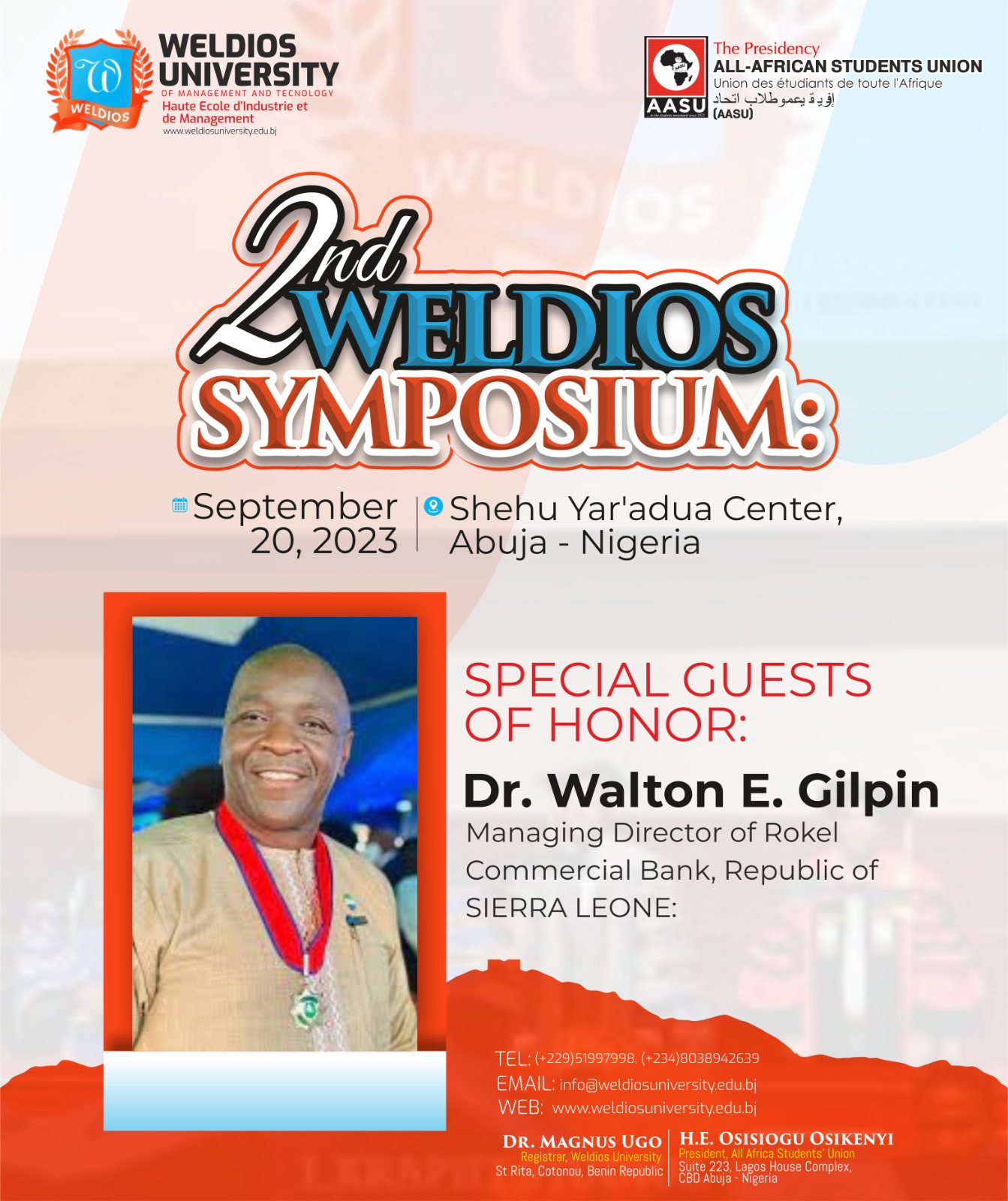 One of the leading Universities in Africa – Weldios University of Management and Technology has extended a ‘special guests of honor’ invitation to the Managing Director and CEO of Rokel Commercial Bank Dr. Walton E. Gilpin to witness and be part of their 2nd Weldios Symposium in Abuja Nigeria.
