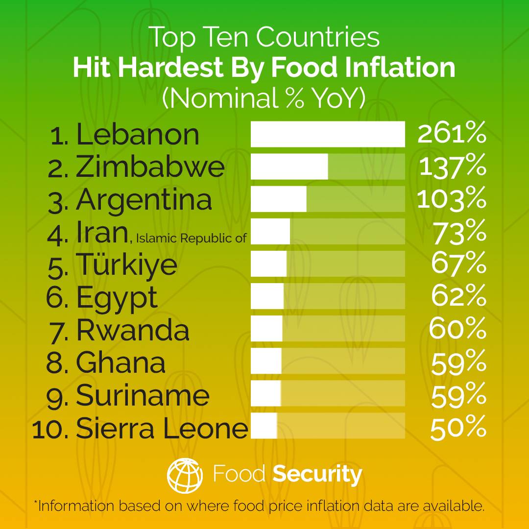 The World Bank has compiled a list of the top ten countries with the highest food price inflation using data from December 2022 to March 2023. The bank reports that food price inflation, measured as the year-on-year change in a country’s Consumer Price Index (CPI), remains high.