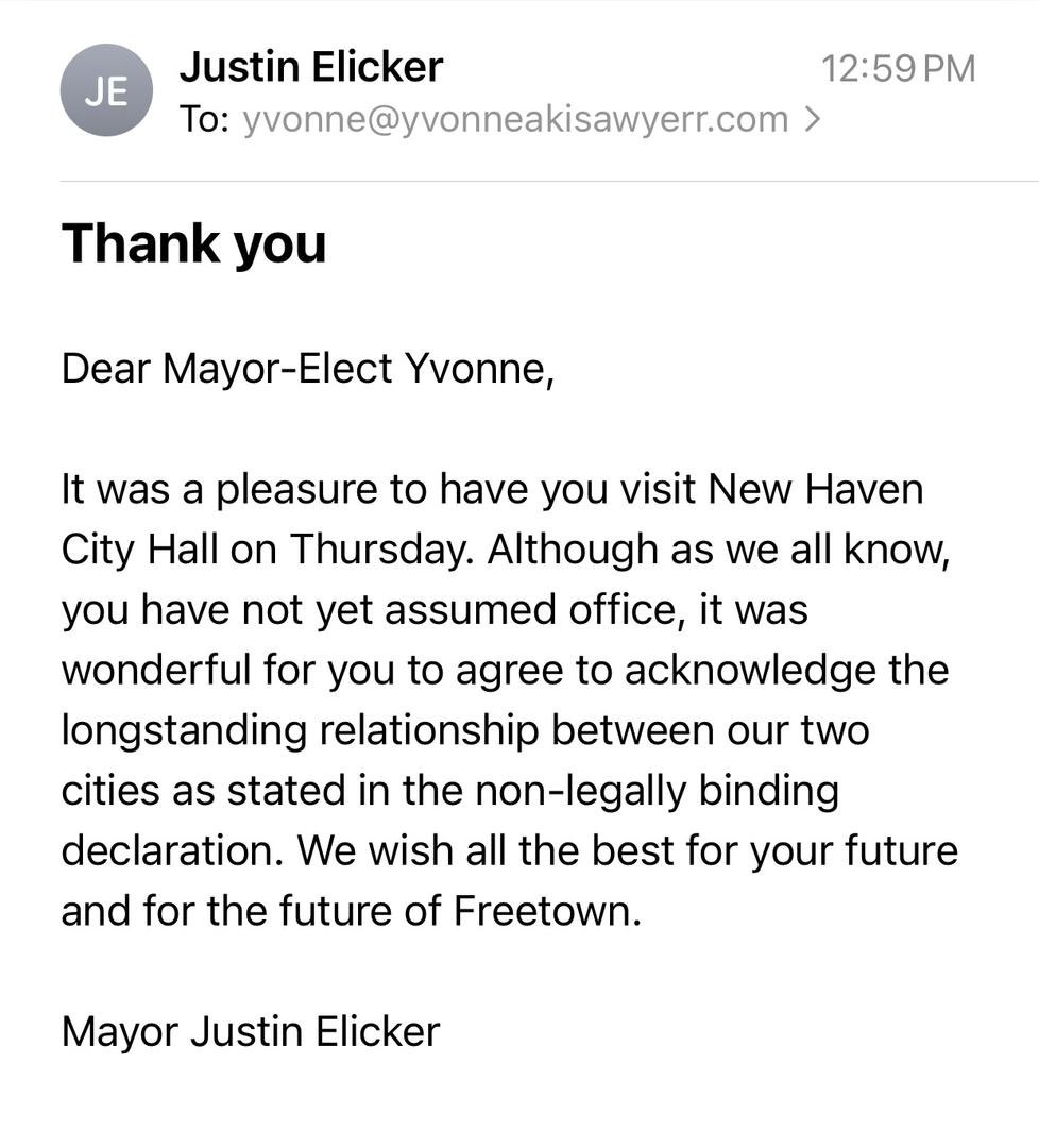 In reply to the above positions the Mayor-elect took to her social media where she said, “Simply acknowledging the existence of a Sister City Agreement legally signed in 1996 and wishing us well for the future is in no way entering into a legal agreement as clearly stated by Mayor Elicker (Mayor of New Haven) in his “Thank you” email below.”