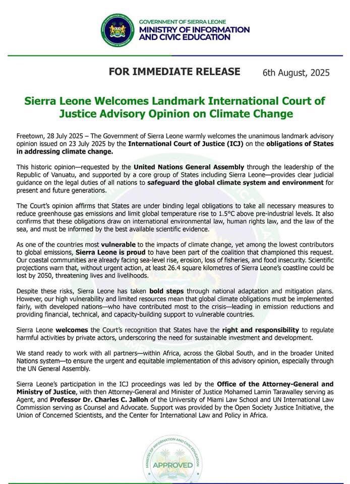 The Government of Sierra Leone has officially welcomed the recent advisory opinion from the International Court of Justice (ICJ) on the obligations of states in addressing climate change. Issued on 23 July 2025, the opinion was unanimously adopted and provides a legal interpretation of the responsibilities of nations under international law to combat climate change.