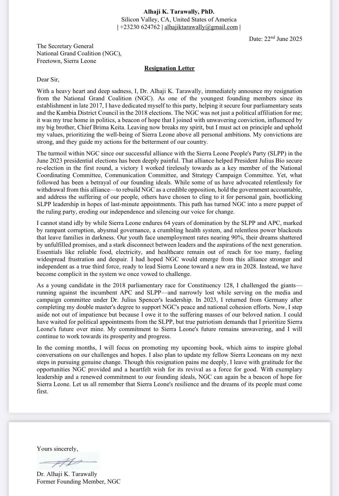 Alhaji.K. shares his official resignation letter, outlining his reasons for leaving the party. He expressed concern that the alliance with President Julius Bio contributed to his victory in the June 2023 presidential elections, a campaign he actively supported as a member of the National Coordinating Committee, Communication Committee, and Strategy Campaign Committee.