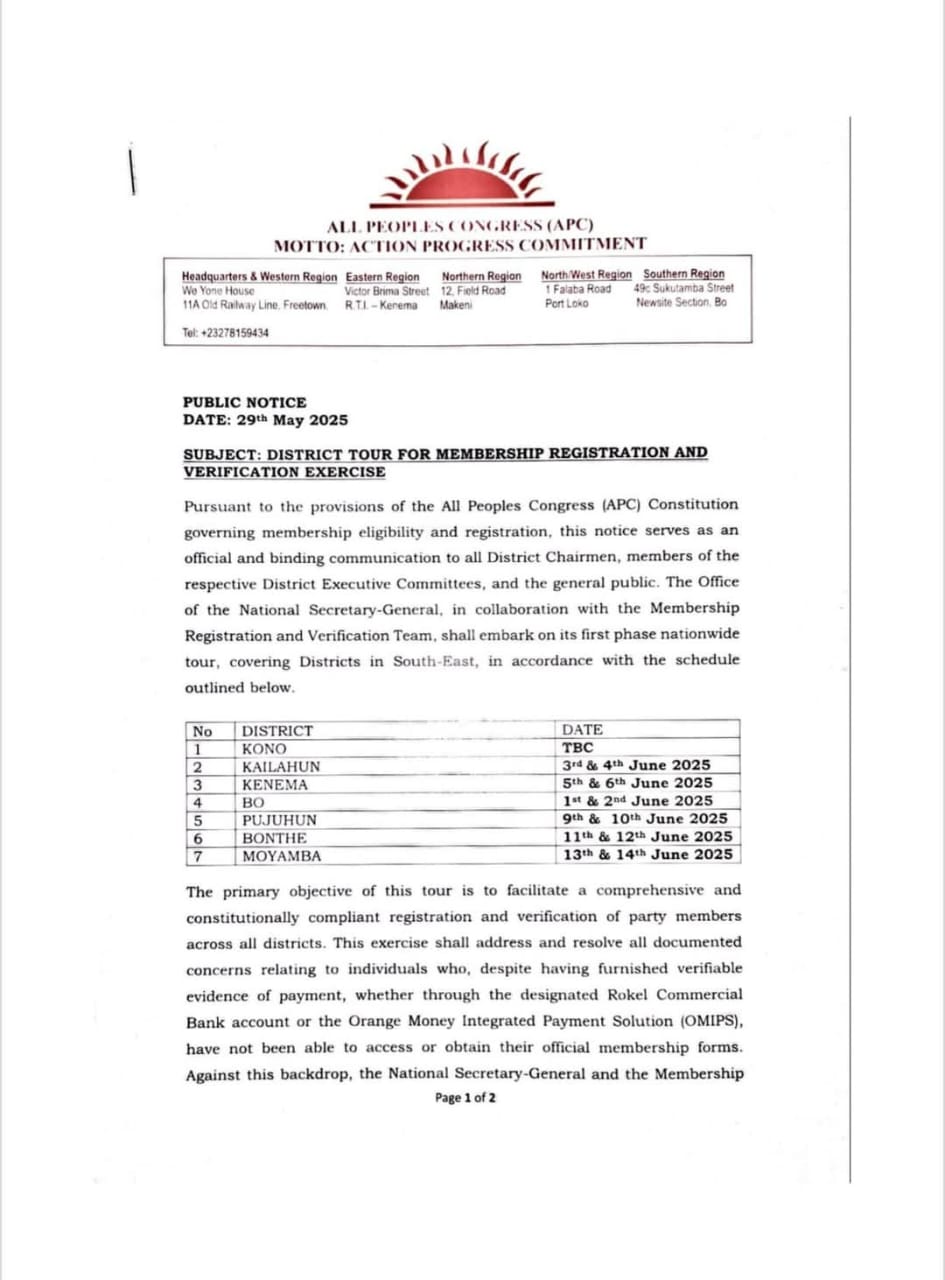 The All Peoples Congress (APC) is set to begin a membership registration and verification tour across districts in the South-East region, starting on Saturday, 1st June 2025.