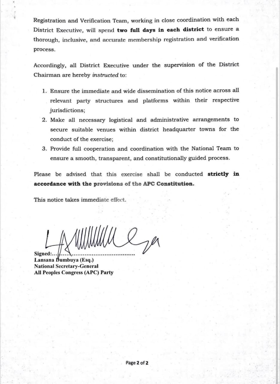 District Chairmen have been instructed to prepare venues in their headquarter towns and provide support throughout the exercise. According to the APC, the entire process will be carried out in line with the party’s constitution and is expected to help strengthen the registration process across all regions involved.