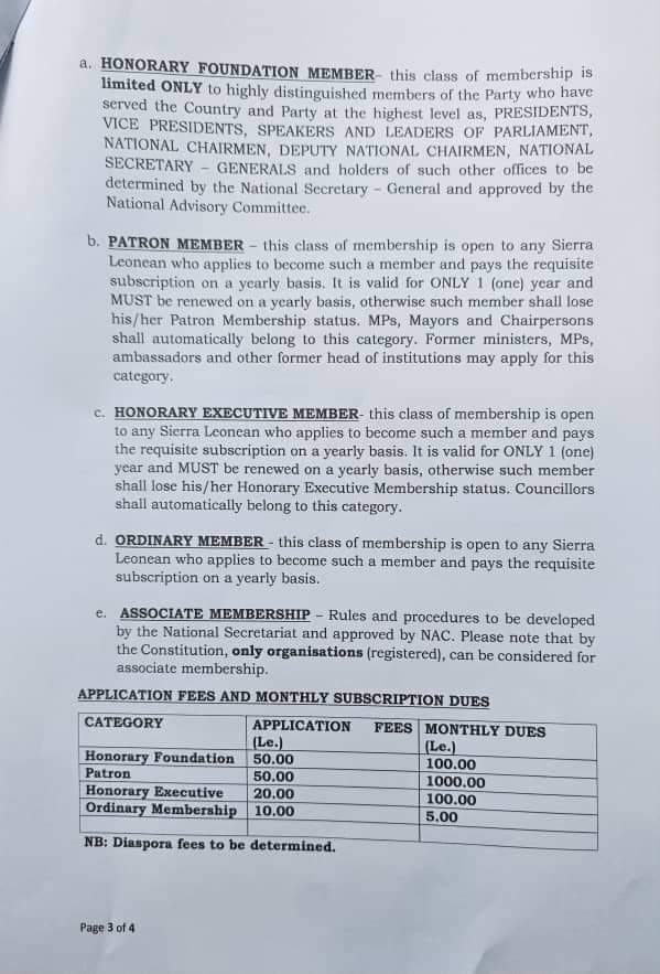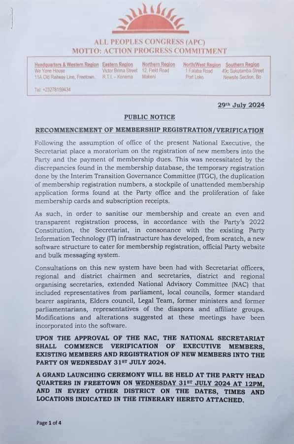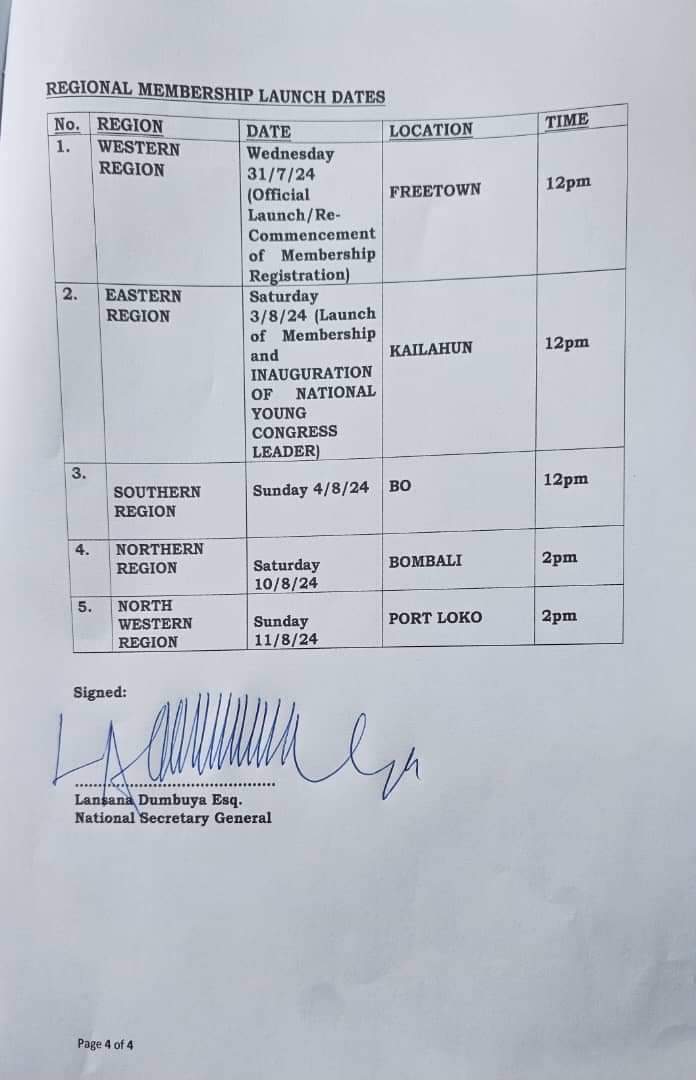 The party has outlined a schedule for the launch of the membership registration process in different regions, with Freetown set to host the official launch on July 31, 2024.