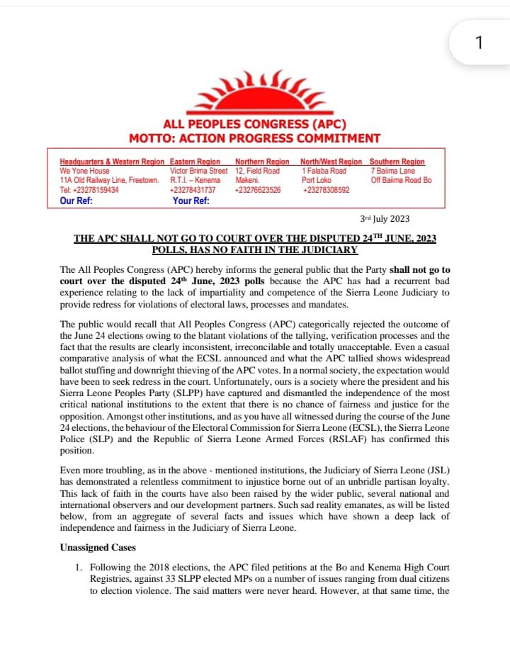 Sierra Leone’s main opposition party the All Peoples Congress (APC) party has today announced that they would not be pursuing legal action regarding the controversial June 24th, 2023 polls.