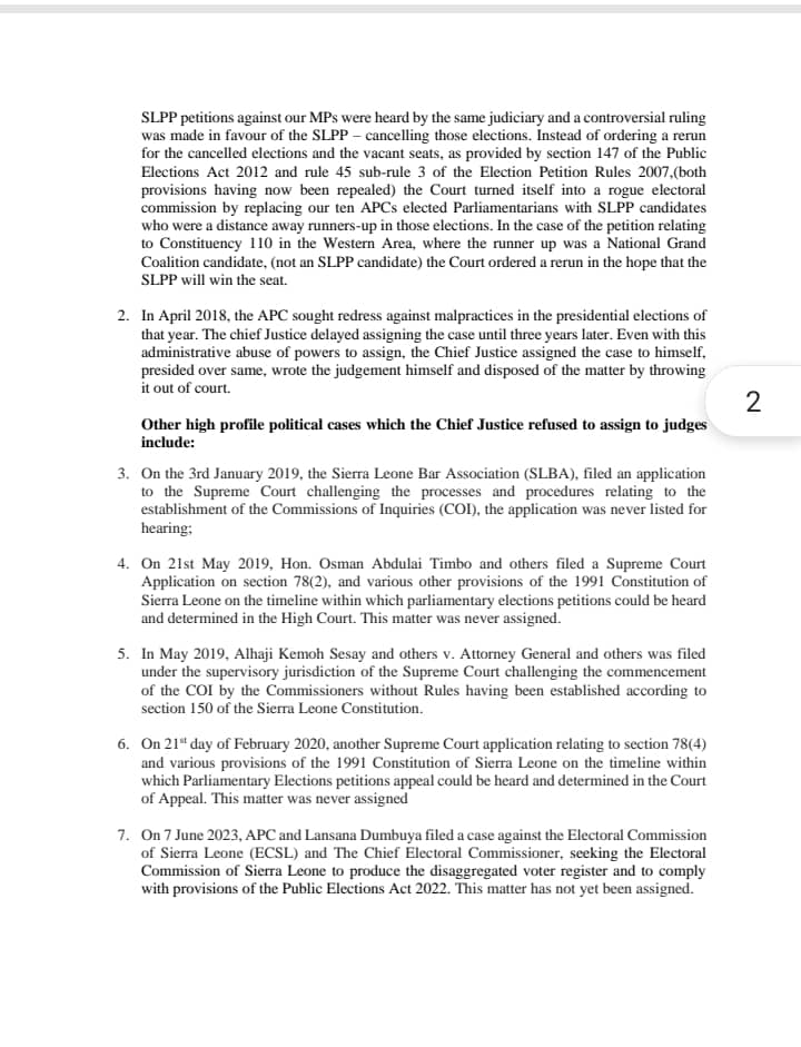The party highlights instances where its petitions against SLPP elected Members of Parliament were not heard, while simultaneously, SLPP petitions against APC MPs were given priority. The court’s controversial rulings resulted in the replacement of ten APC elected Parliamentarians with SLPP candidates. These incidents, along with other high-profile cases, have eroded the party’s faith in the judiciary’s independence and fairness.