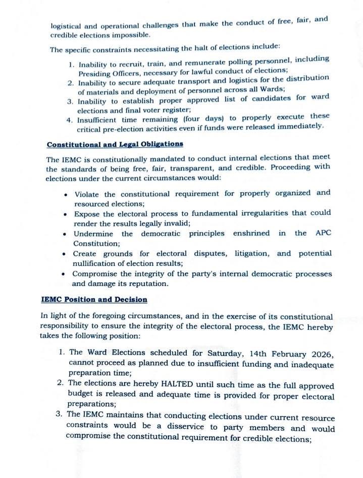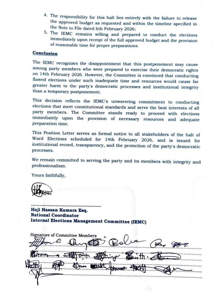 In a formal position letter dated 10 February 2026, the party’s Internal Elections Management Committee (IEMC) announced that the ward elections slated for Saturday, 14 February 2026, “cannot proceed as planned due to insufficient funding and inadequate preparation time.”