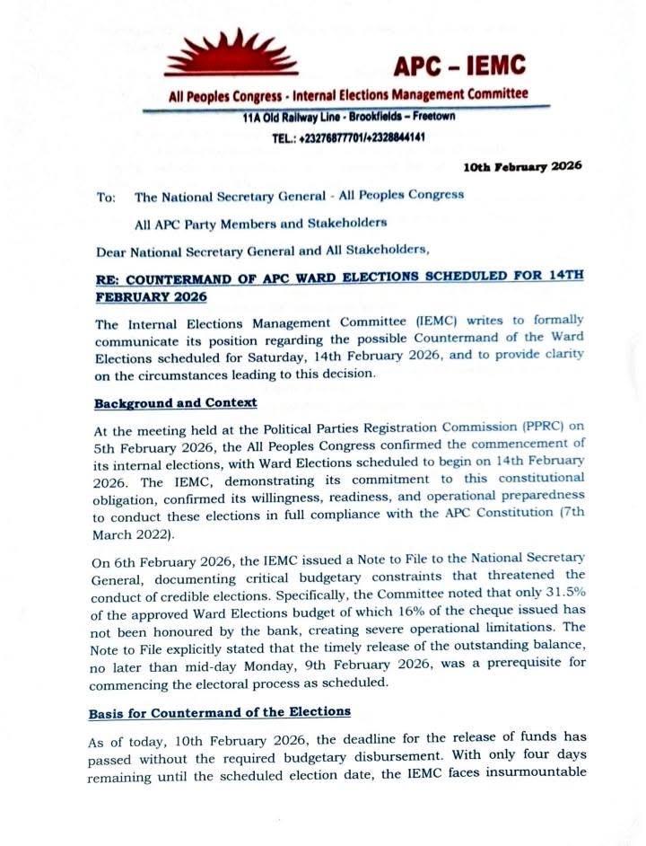 According to the IEMC, although the APC had confirmed the commencement of its internal elections during a meeting at the Political Parties Registration Commission (PPRC) on 5 February 2026, the committee has not received the full approved budget required to conduct the ward-level polls.