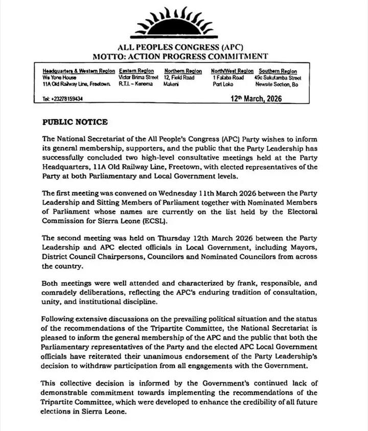 The statement indicated that the decision was informed by what the party described as the government’s continued lack of demonstrable commitment toward implementing the recommendations of the Tripartite Committee, which were established to improve the credibility of future elections in Sierra Leone.