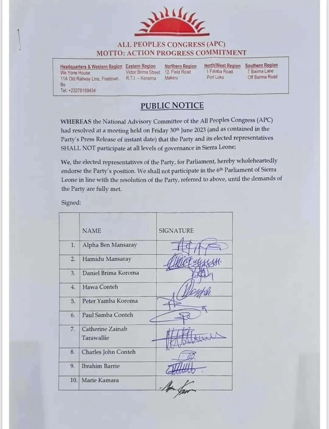 The elected representatives of the APC in Parliament have wholeheartedly endorsed this position and have vowed to abstain from participating in the country’s 6th Parliament until their party’s demands are met.