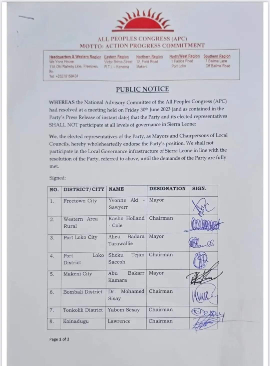 The newly elected Mayors and Members of Parliament (MPs) from Sierra Leone’s main opposition party, the All People’s Congress (APC), have declared their intent to abstain from participating in the governance processes of the state.