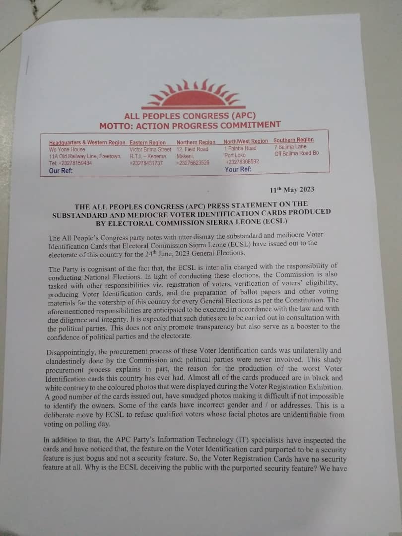 The press release stated that the APC notes with utter dismay the substandard and mediocre Voter Identification Cards that the ECSL have issued out to voters for the June 24th, 2023 elections adding that the APC is cognizant of the fact that the ECSL is inter alia charged with the responsibility to conduction national elections with the mandate to registered voters, verification of voters eligibility, produce voter identification cards and the preparation of ballot papers and other electoral material for voters.