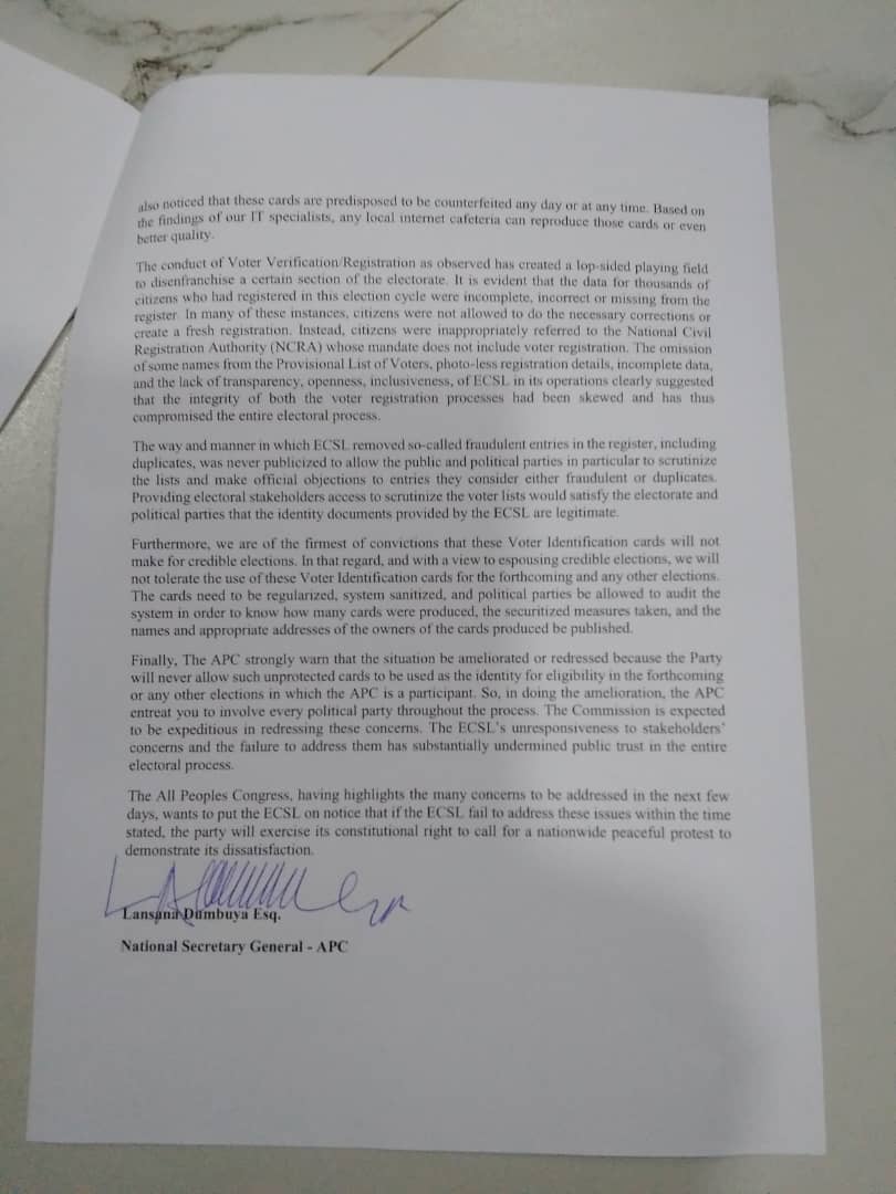 “The All People’s Congress having highlighted the many concerns to be addressed in the next few days wants to put the ECSL on notice that if the ECSL fails to address these issues within the time stated, the party will exercise its constitutional right to call for a nationwide peaceful protest to demonstrate its dissatisfaction”.