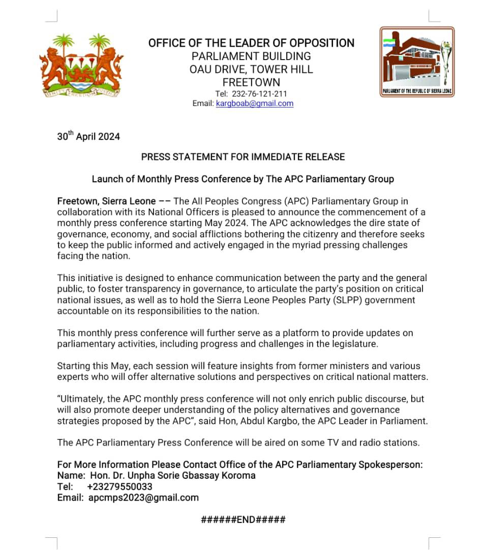 The All Peoples Congress (APC) Parliamentary Group, in collaboration with its National Officers, announced the launch of a monthly press conference series starting in May 2024.