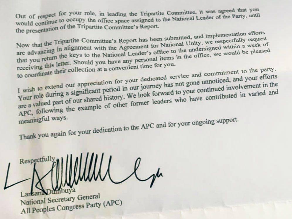 The Secretariat, in the letter, requested that their former leader vacate the office of the Leader at their party headquarters in Brookfields, Freetown since the Tripartite Committee has completed their work.