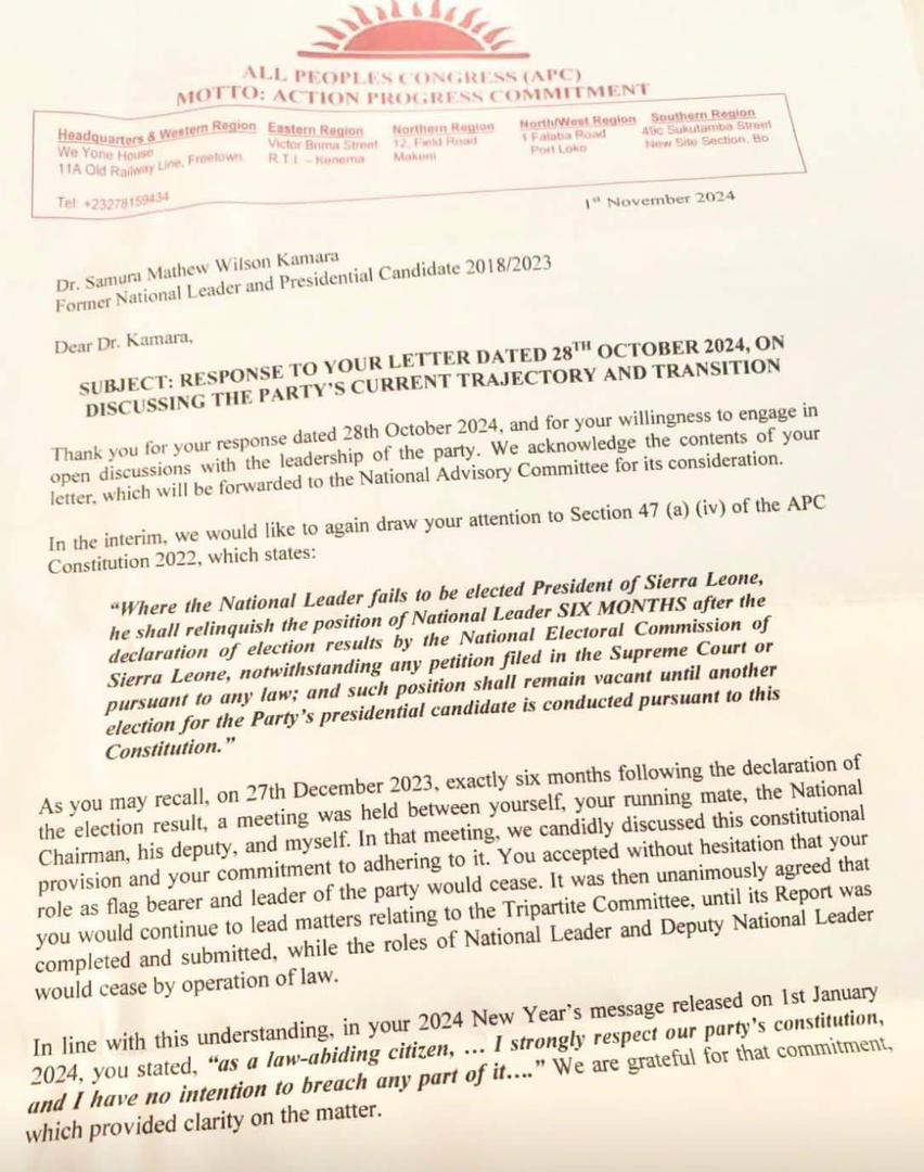 In a letter signed by the party’s addressed to Samura Kamara, the party’s Secretary General said it is unconstitutional for the veteran politician to hold on to the position of leader of the party six months after elections since he failed to win in 2023. The party’s Secretary General, Lansana Dumbuya hinged his decision on Section 47 (a) (iv) of the new APC Constitution.