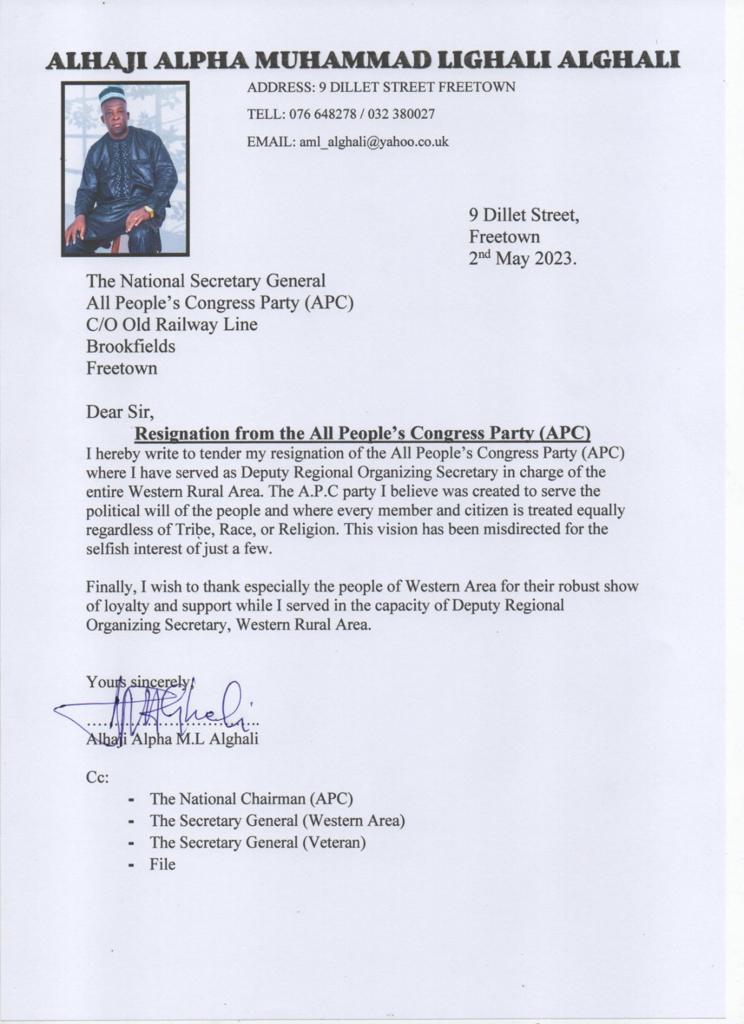 The Deputy Organising Secretary of the Main Opposition, All People’s Congress (APC), Alhaji Alpha Muhammad Lighali Alghali, on Tuesday 2nd May 2023, resigned from his position.