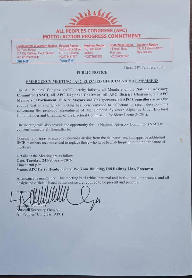 The public notice was issued by the National Secretary-General of the APC, Lansana Dumbuya, and released from the party’s headquarters in Freetown.