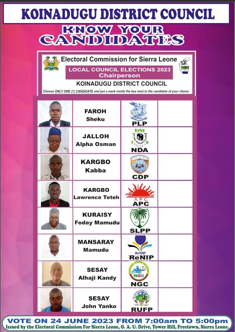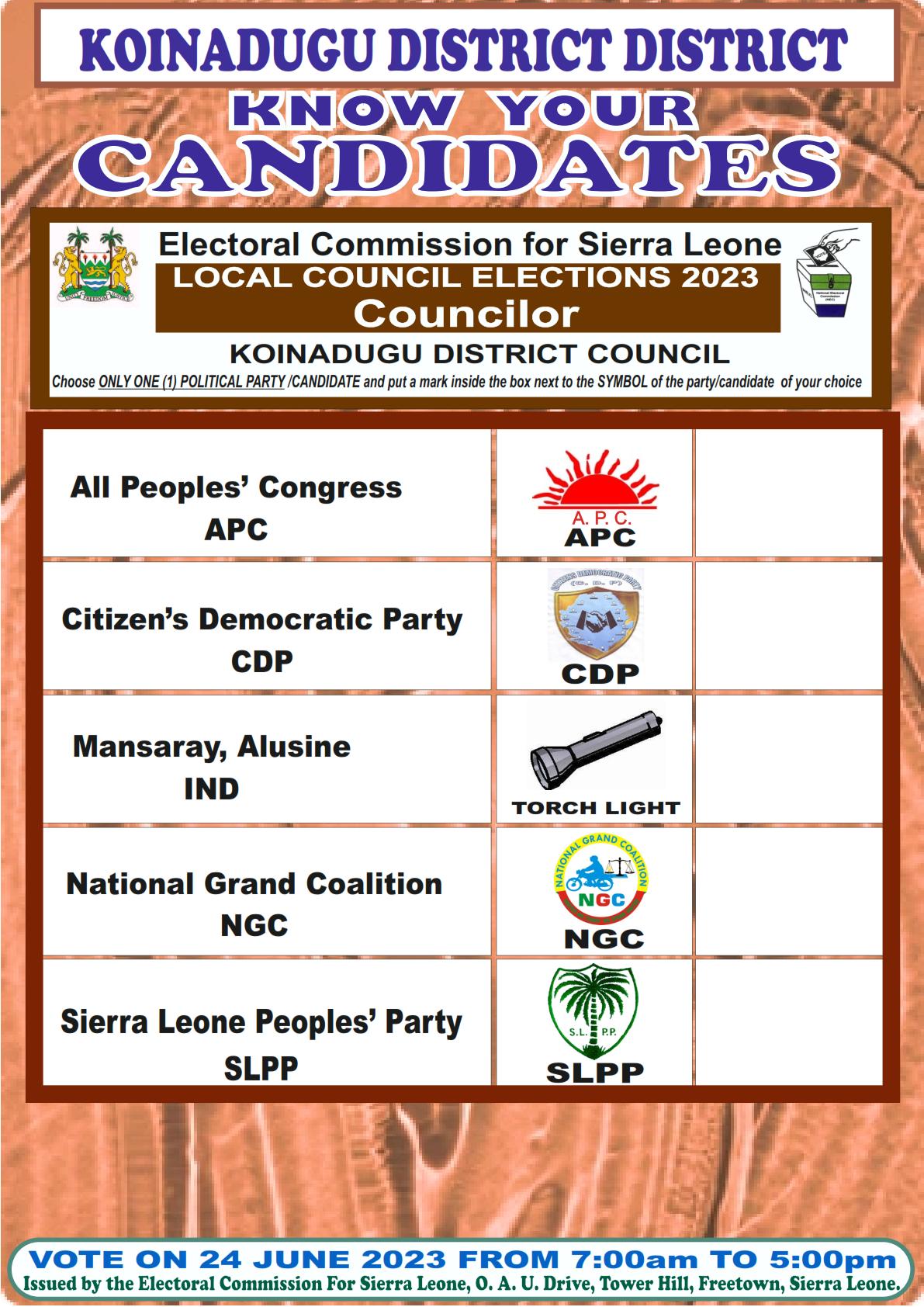 The June 24, 2023, general elections are just around the corner and it is pertinent for every voter around the Koinadugu axis to be familiar with their candidates.