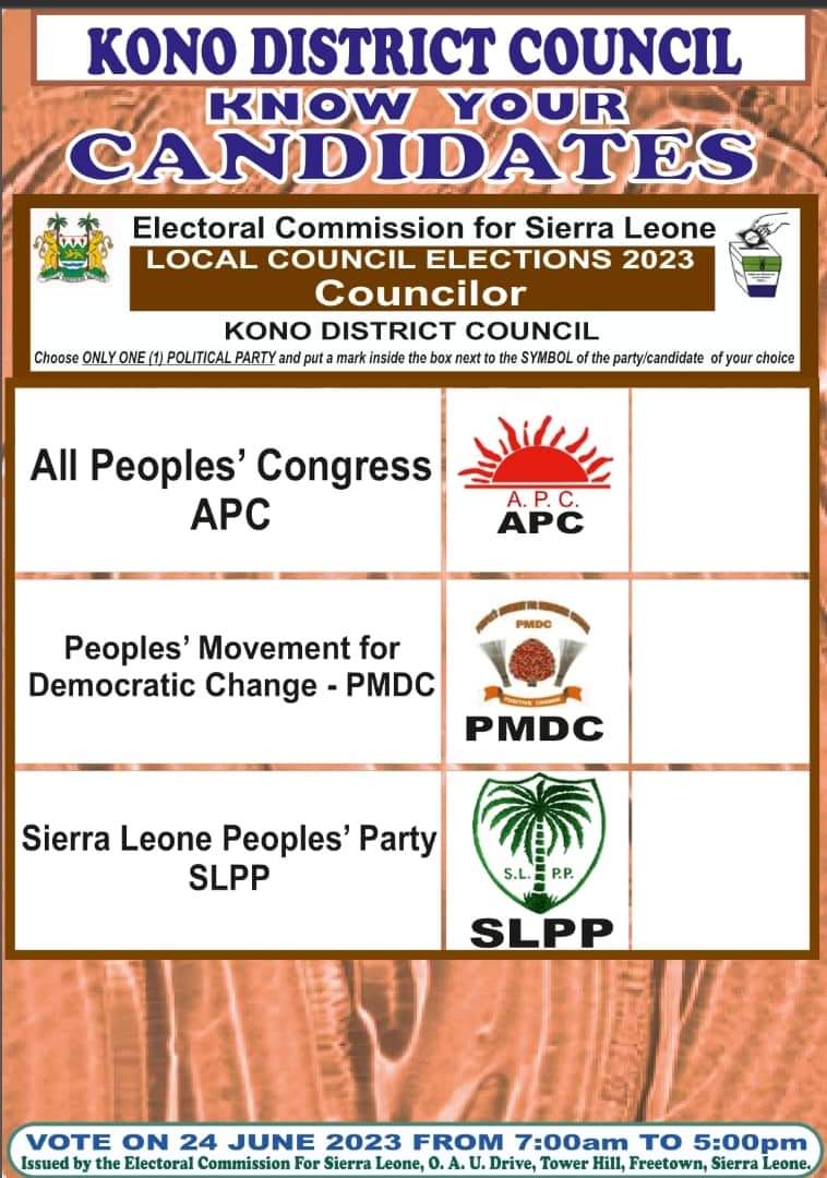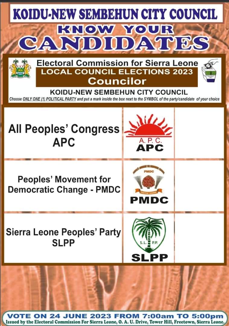 The filed in candidates for councillor (district and city council) position includes: all peoples congress party (APC), Peoples’ Movement for Democratic Change-(PMDC), Sierra Leone Peoples Party-(SLPP)
