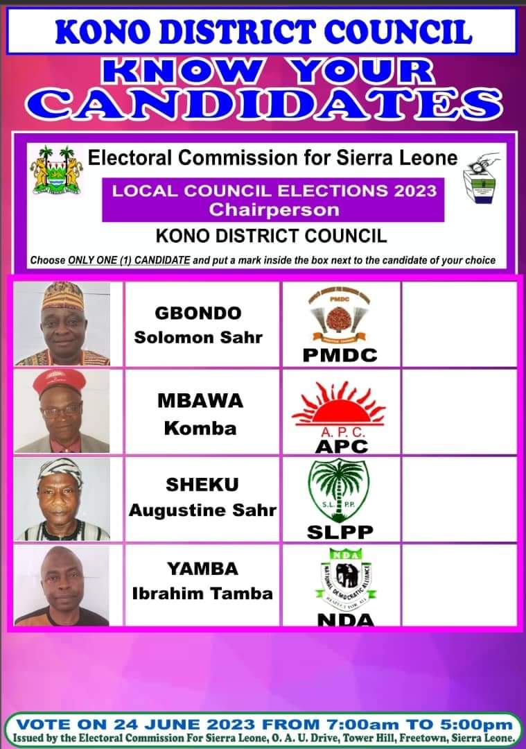 The Filed In Candidates For Chairperson Position Includes: Gbondo Solomon Sahr-PMDC, Mbawa Komba-APC, Sheku Augustine Sahr-SLPP And Yamba Ibrahim Tamba-NDA.