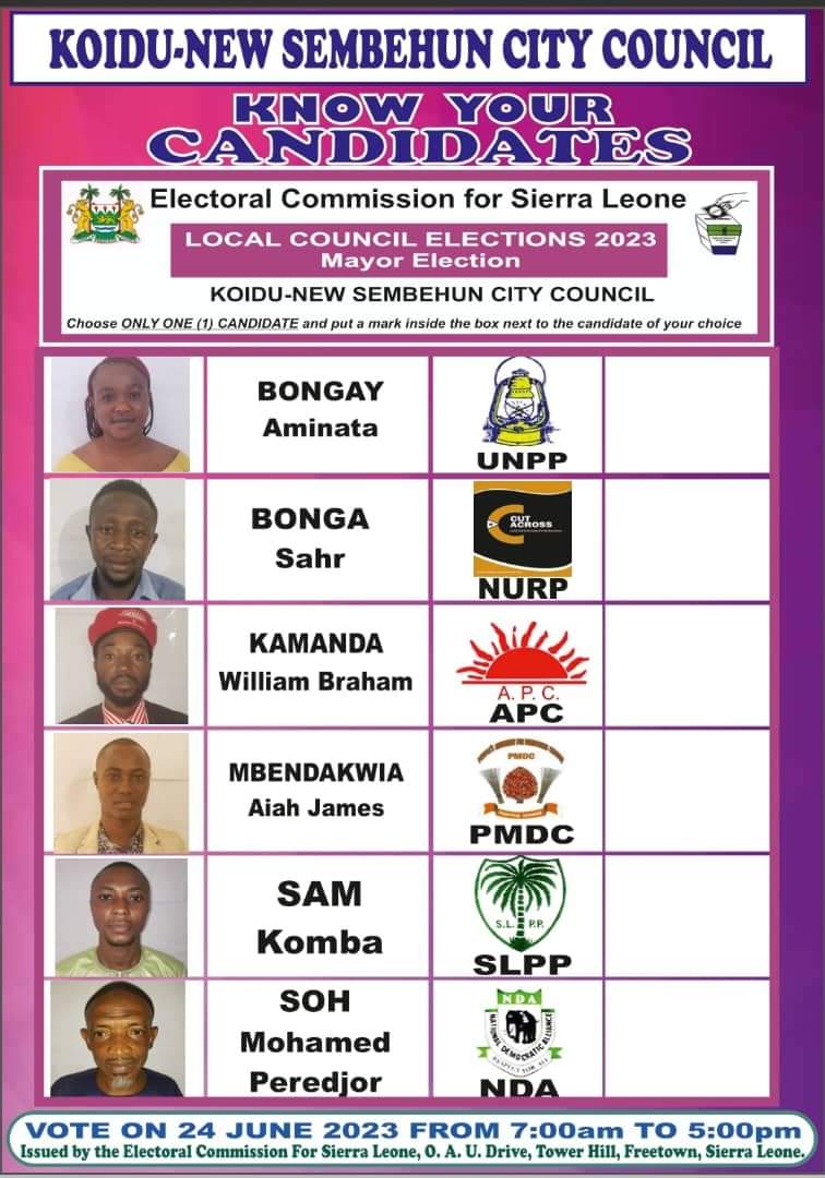 The filed in candidates for mayoral position includes: Bongay Aminata-UNPP, Bonga Sahr-NURP, Kamanda William Btaham-APC, Mbendakwia Aiah James-PMDC, Sam Komba-SLPP, Soh Mohamed Peredjor-NDA.