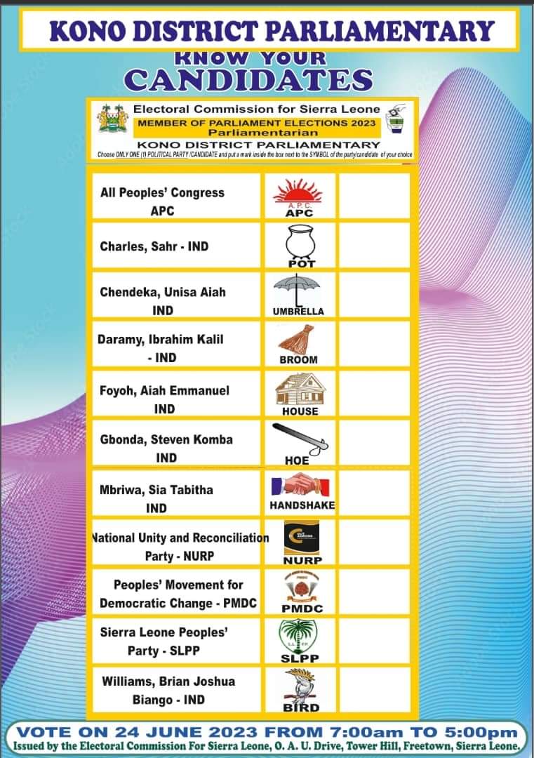 The filed in candidates for Member of Parliament position includes: All Peopes Congress Party-(APC), Charles Sahr –Independent, Chendeka, Unisa Aiah-Independent, Daramy Ibrahim Kalil-Independent, Foyoh Aiah Emmanel-Independent, Gbonda Steven Komba-Independent, Mbriwa Sia Tabitha-Independent, National Unity And Reconciliation Party-(NURP), Peoples’ Movement For Democratic Change-(PMDC), Sierra Leone Peoples Party-(SLPP) And Williams Brian Joshua-Independent.