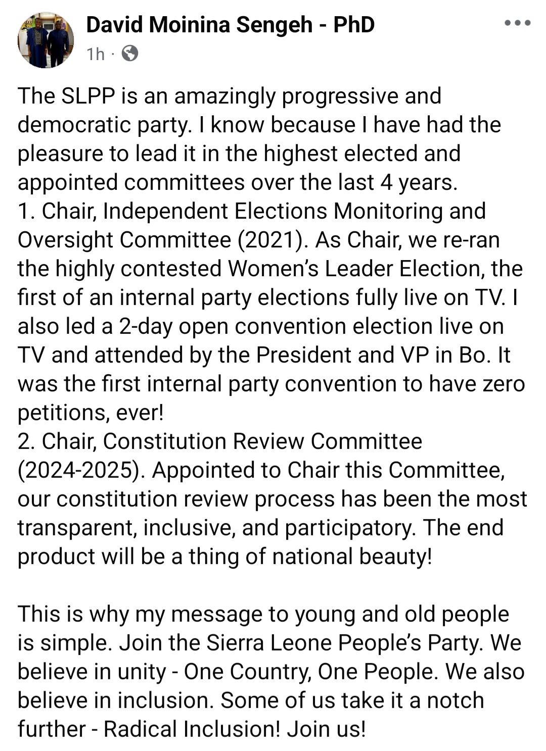 In a recent post, Sierra Leone’s Chief Minister, David Sengeh, shared a message with both young and old citizens of Sierra Leone, encouraging them to join his Sierra Leone People’s Party (SLPP).