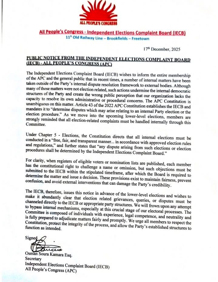 The Independent Elections Complaint Board (IECB) of the All People’s Congress (APC) has issued a stern warning to party members about bypassing the party’s internal dispute resolution procedures in handling election-related complaints.