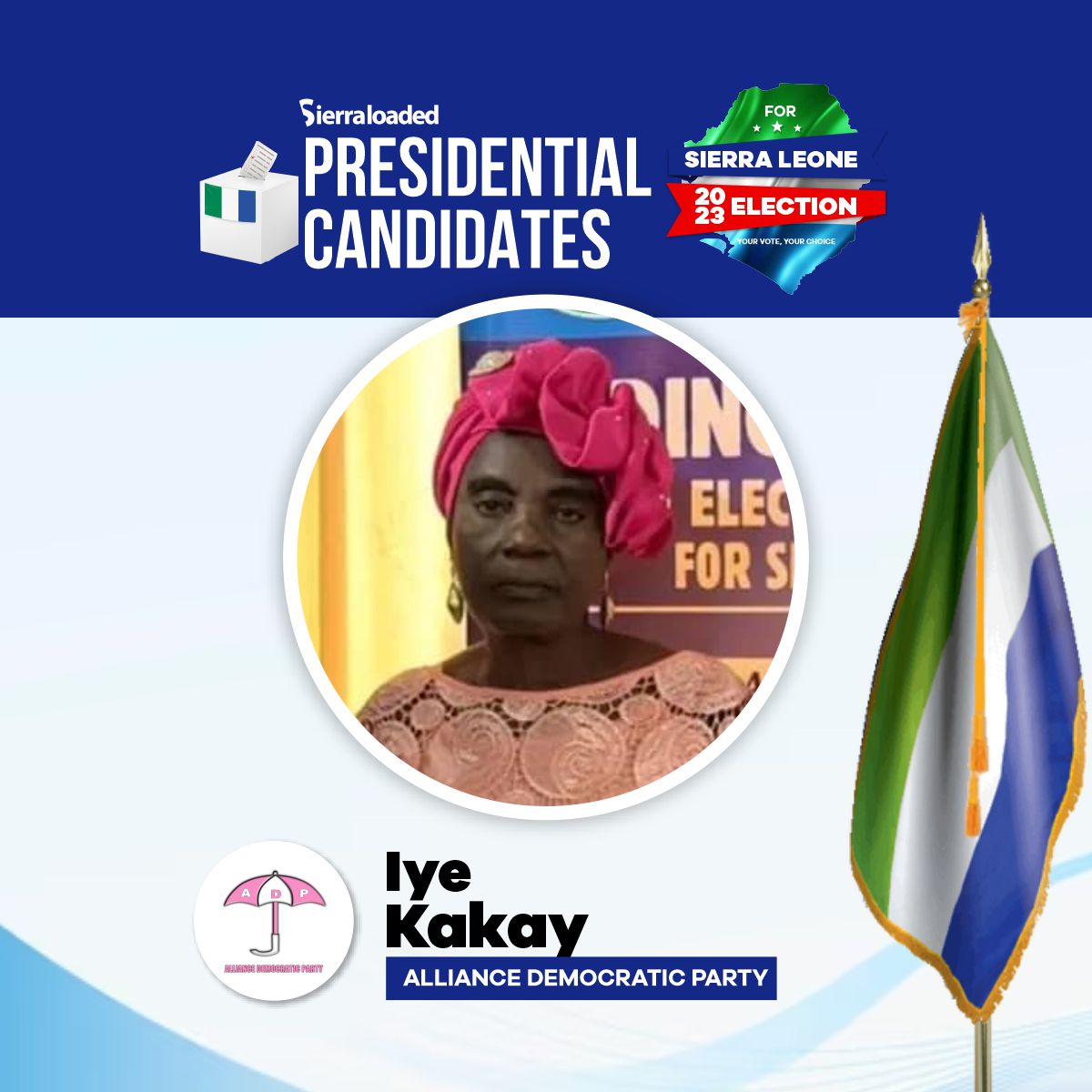 Iye Kakay is the presidential candidate for the Alliance Democratic Party (ADP) in the 2023 elections in Sierra Leone. She made history by becoming the first woman to be selected as the ADP’s presidential flagbearer since its establishment in 2015 by its founder, Mohamed Kamarainba Mansaray. With her running mate, Franklyn Kobi, Kakay aims to bring about positive change and progress to the country.
