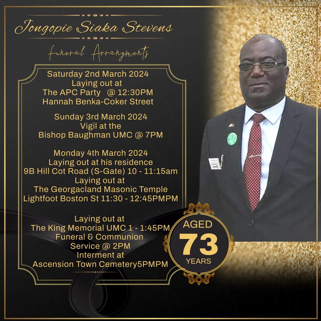 According to the family, there will be a Laying out at All People’s Congress (APC) headquarters Hannah Benka-Coker in Freetown on Saturday 2nd March 2024 at 12:30 followed by a PM Vigil at the Bishop Baughman UMC at 7 PM on Sunday 3rd March 2024.
