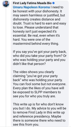 The First Lady warned that the true intentions of politicians like Koroma would soon be exposed to the party’s members. She also advised Koroma to remove references to her title in his post and focus instead on addressing the presidency, hinting that someone within the presidency might need to see his message.