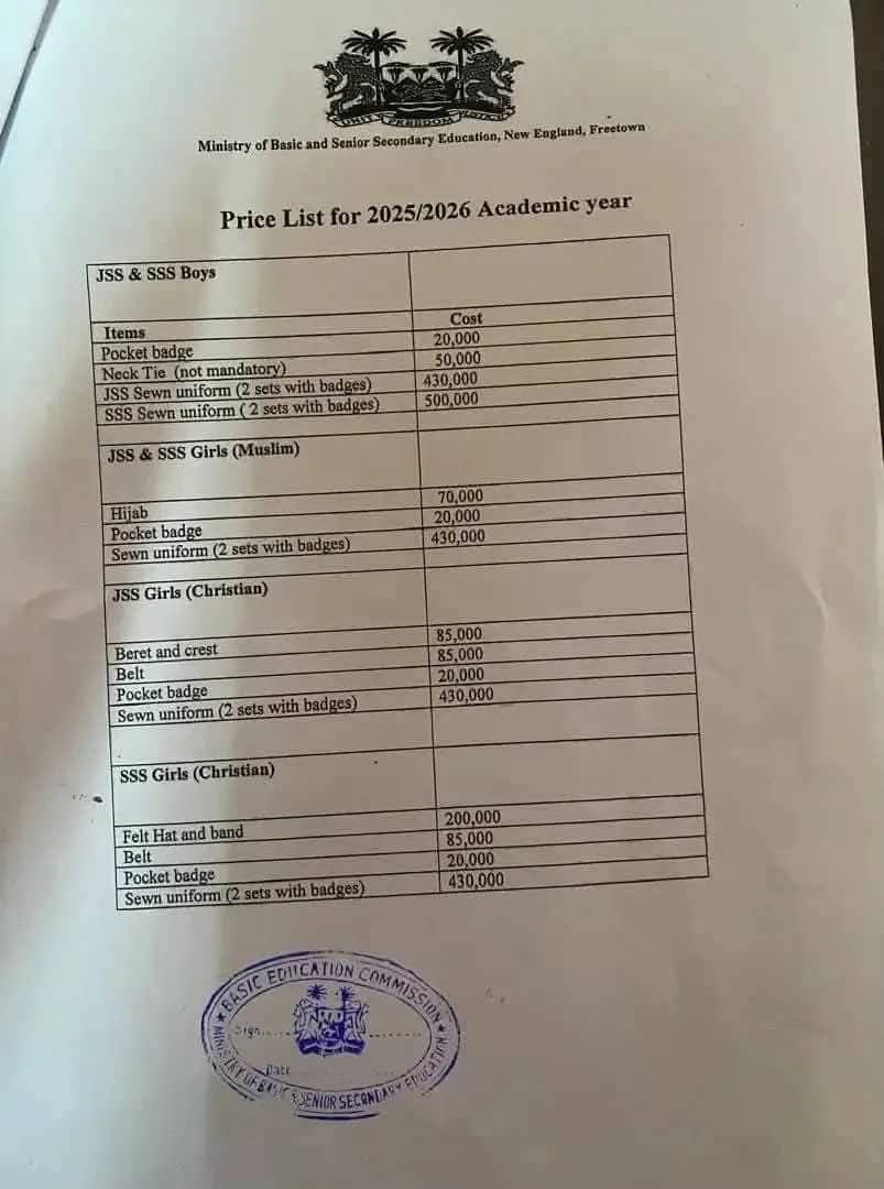 According to Kamarainba, he said, ‘’These are the price list for the upcoming 2025/2026 school year. What a shame! Maada Bio is a complete failure to the people of Sierra Leone.’’